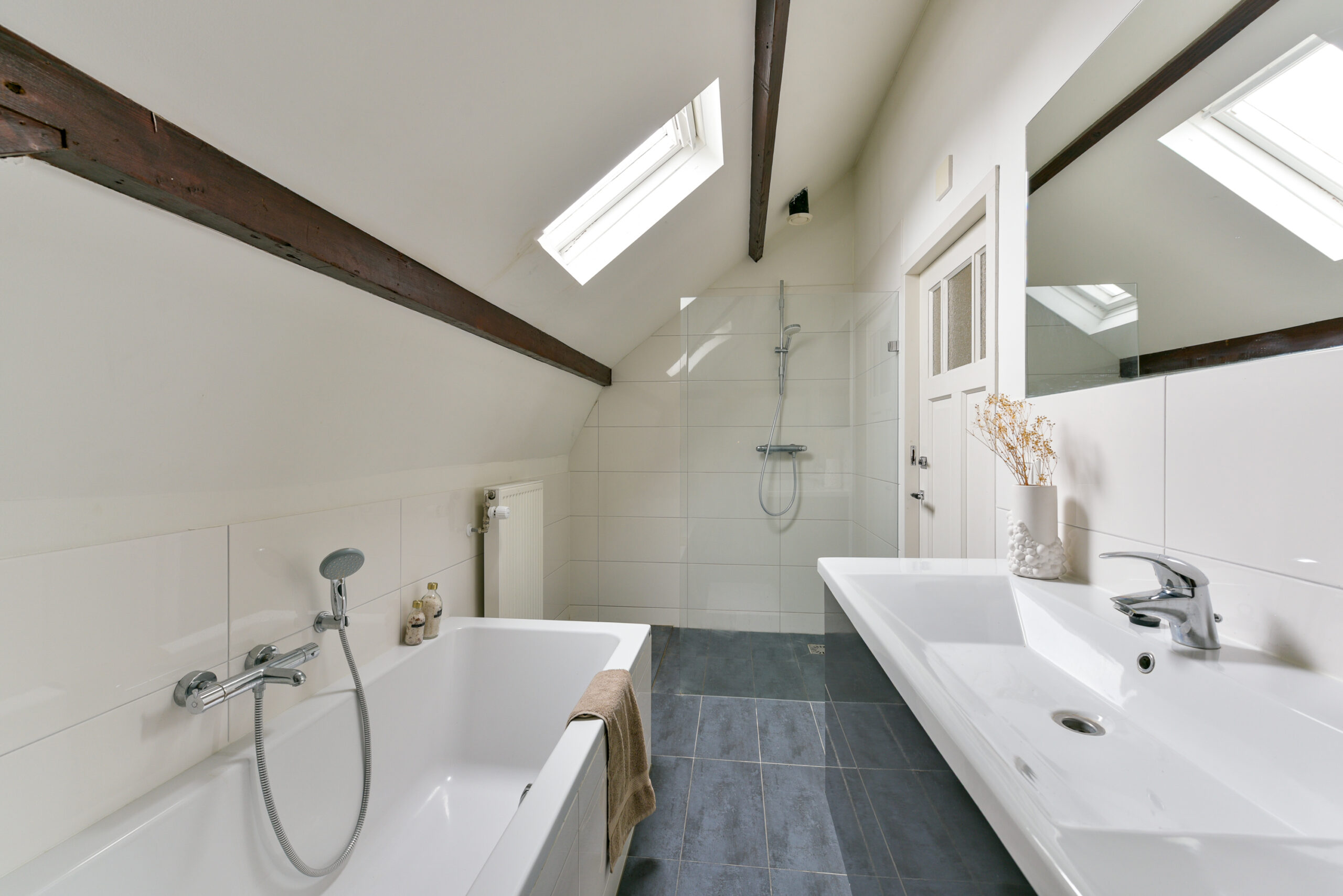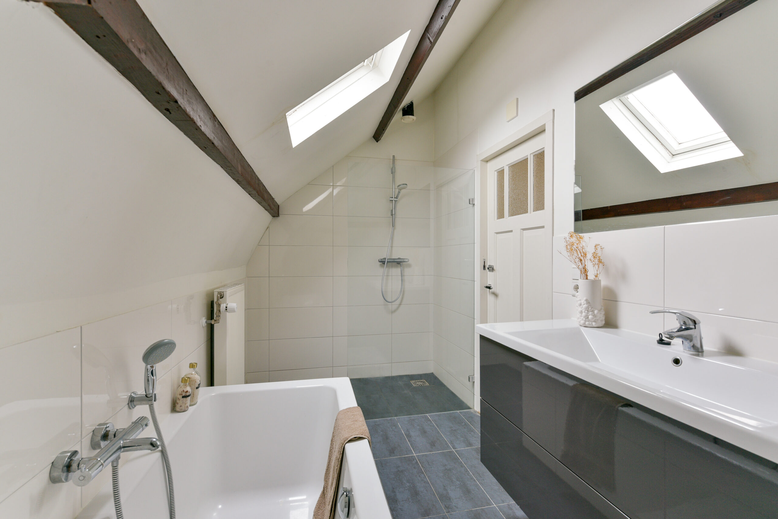 Via een stalen trap komt u via een ruim dakterras bij de woning.