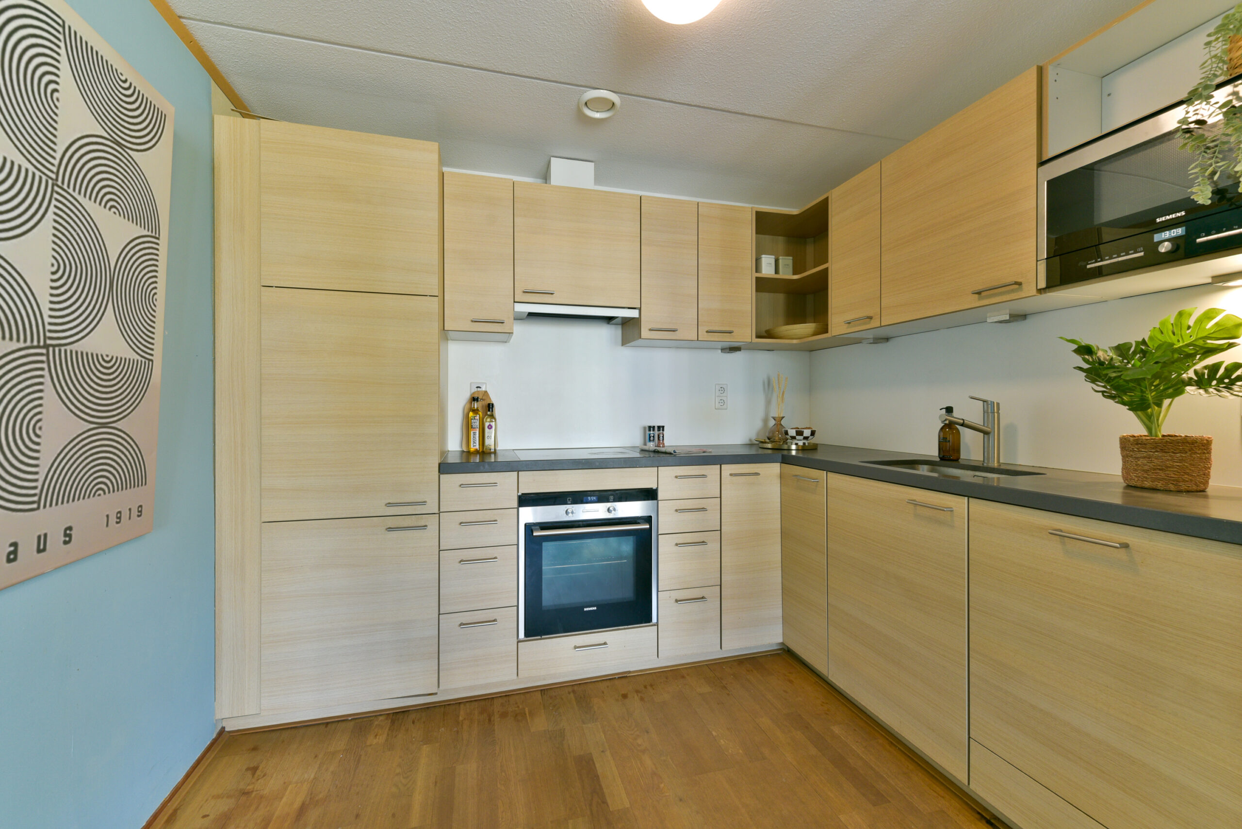 Woonkamer met open keuken, voorzien van Siemens inbouwapparatuur en een derde kamer.