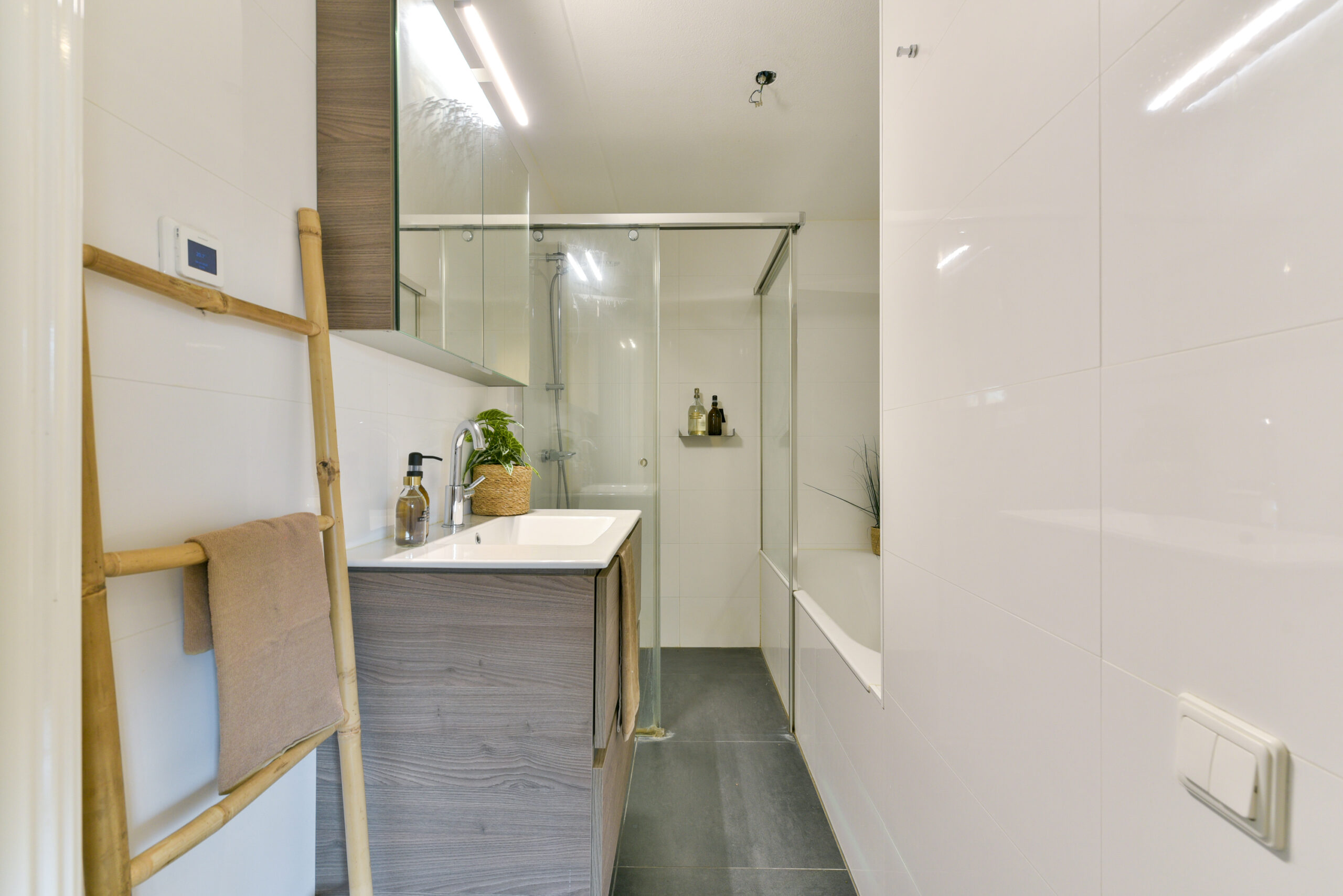 entree, gang, kast met opstelplaats voor de wasmachine, toilet, 2 slaapkamers en een badkamer (gerenoveerd in 2016) met bad, separate douche, vloerverwarming en een wastafelmeubel.