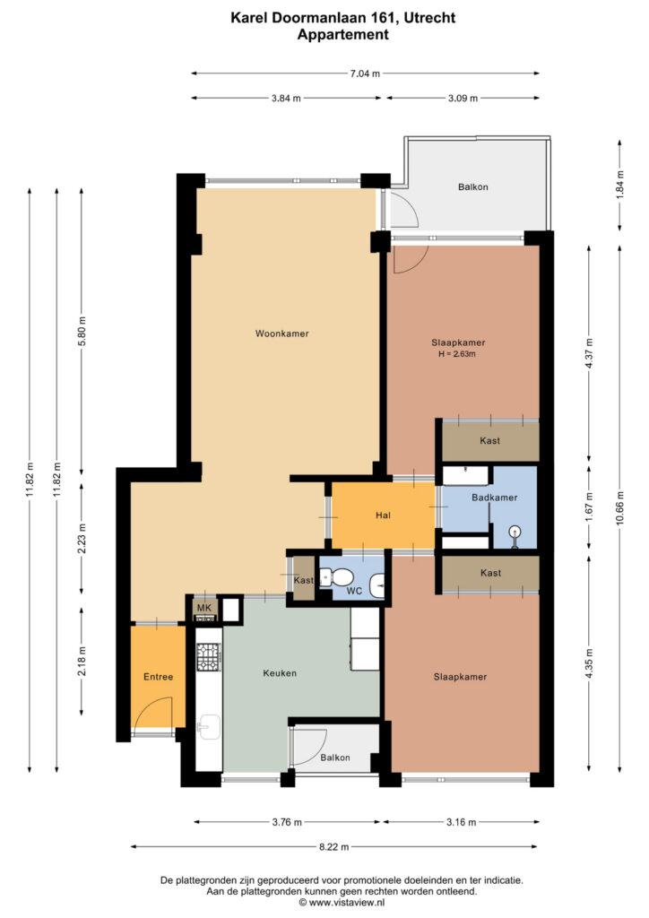 entree, ruime hal en toegang naar een lichte woonkamer met een ruim balkon aan de voorzijde, twee slaapkamers, moderne douche, separaat toilet en moderne woon-eetkeuken met diverse apparatuur. Naast de keuken is nog een kleine loggia, waar u wat extra opslagruimte heeft.